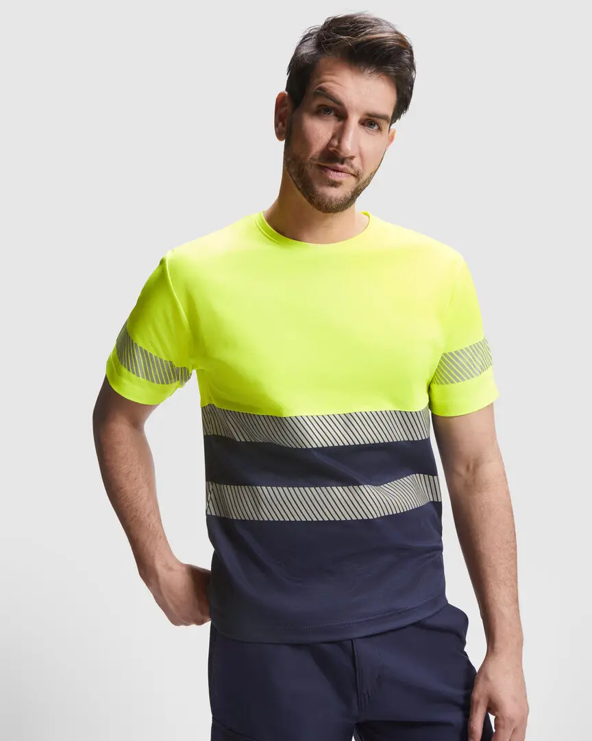 con manga corta, reflectante, y cuello en pico con tres botones.